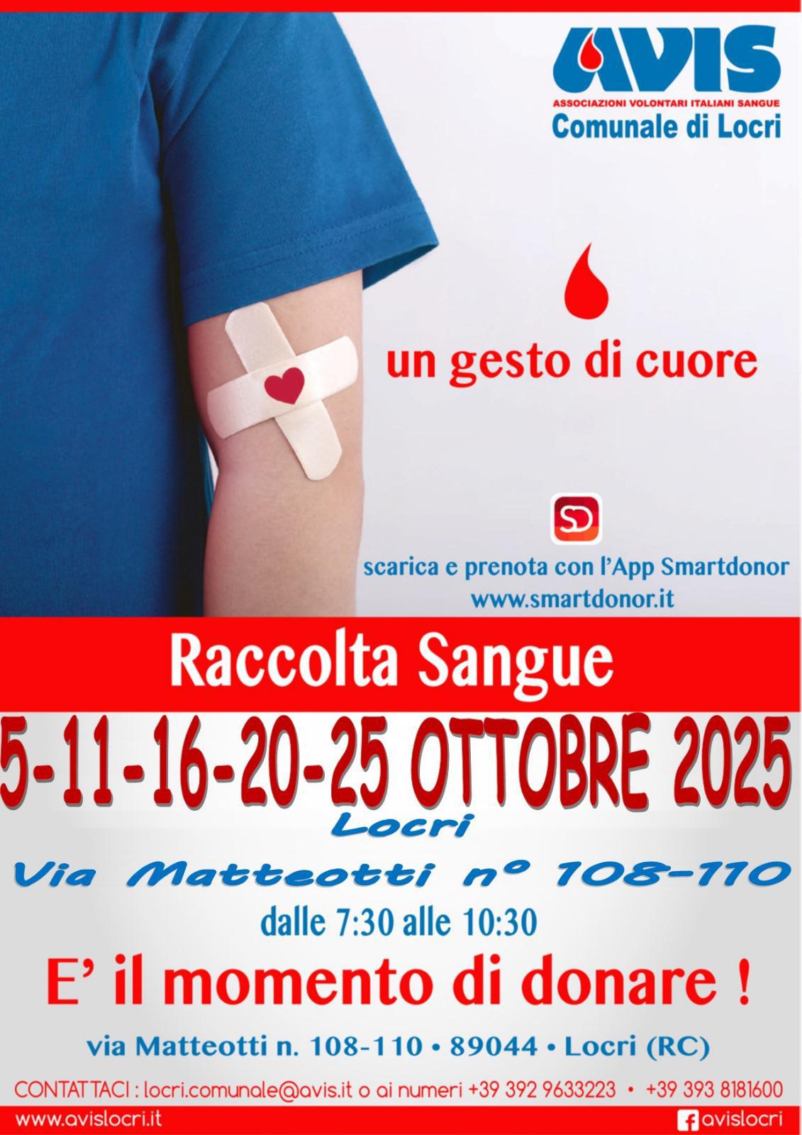 L'Avis Comunale di Locri effettuerà raccolta di sangue i giorni 5 - 11 - 16 - 20 - 25 ottobre 2025 presso la sede dell'AVIS in via Matteotti 108/110 a Locri dalle ore 07:30 alle ore 10:30. Dopo la donazione come di consueto offriremo la colazione.
