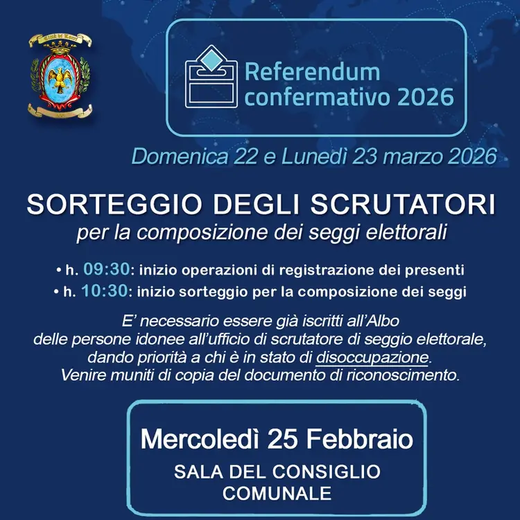 📝 Sorteggio degli scrutatori per la composizione dei seggi elettorali in vista del Referendum confermativo del 22 e 23 marzo 2026 📌 Mercoledì 2️⃣5️⃣ febbraio 2026 📍 Sala del Consiglio Comunale • Locri