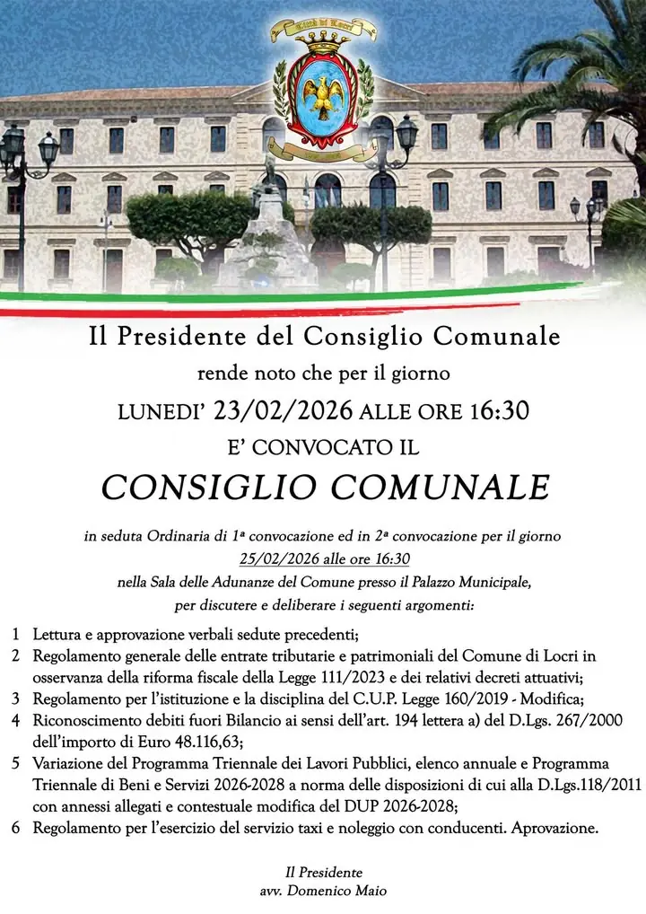 🟢 CONVOCAZIONE CONSIGLIO COMUNALE 🔴 ➡️ Lunedì 2️⃣3️⃣ febbraio 2026 ore 16:30 ✅ 6 i punti all'OdG.