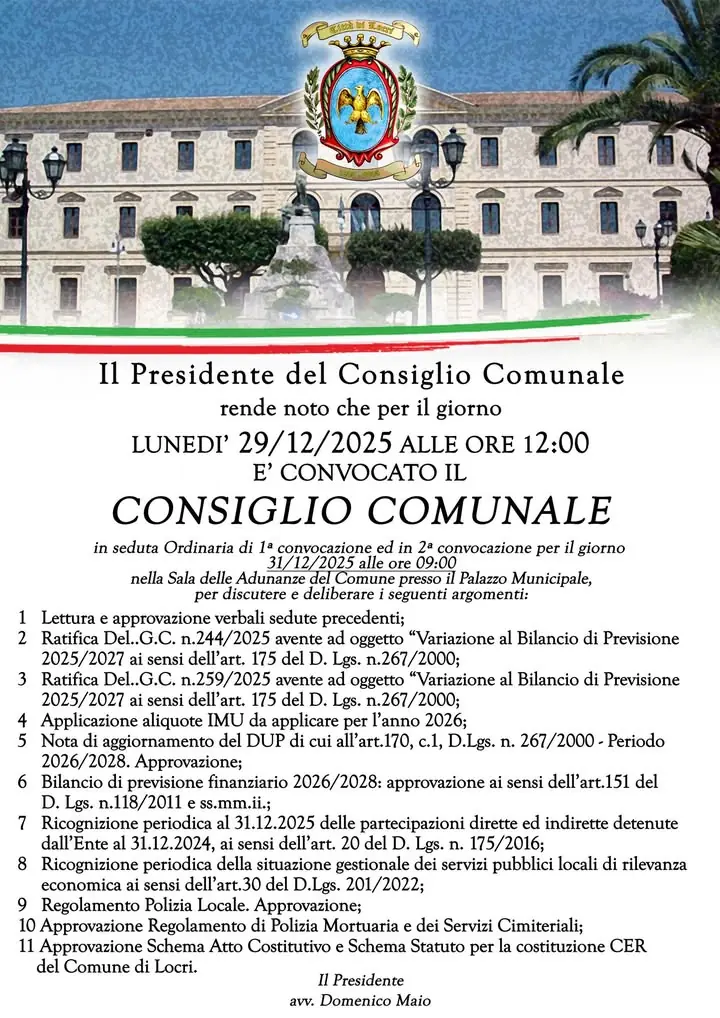 🟢 CONVOCAZIONE CONSIGLIO COMUNALE 🔴 ➡️ Lunedì 2️⃣9️⃣️ dicembre 12:00 ✅ 11 i punti all'OdG.