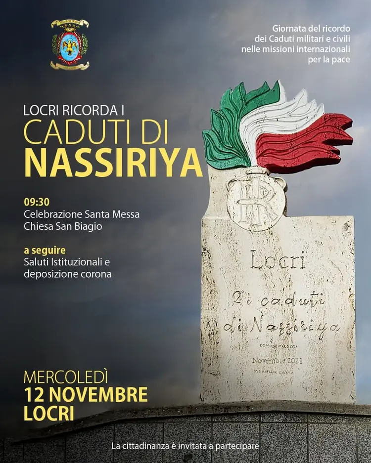 🇮🇹 Locri ricorda i 𝐂𝐚𝐝𝐮𝐭𝐢 𝐝𝐢 𝐍𝐚𝐬𝐬𝐢𝐫𝐢𝐲𝐚 nella 𝐺𝑖𝑜𝑟𝑛𝑎𝑡𝑎 𝑑𝑒𝑙 𝑟𝑖𝑐𝑜𝑟𝑑𝑜 𝑑𝑒𝑖 𝐶𝑎𝑑𝑢𝑡𝑖 𝑚𝑖𝑙𝑖𝑡𝑎𝑟𝑖 𝑒 𝑐𝑖𝑣𝑖𝑙𝑖 𝑛𝑒𝑙𝑙𝑒 𝑚𝑖𝑠𝑠𝑖𝑜𝑛𝑖 𝑖𝑛𝑡𝑒𝑟𝑛𝑎𝑧𝑖𝑜𝑛𝑎𝑙𝑖 𝑝𝑒𝑟 𝑙𝑎 𝑝𝑎𝑐𝑒 📌 Mercoledì 12 Novembre dalle ore 9:30 Chiesa di San Biagio per la Santa Messa e a seguire Piazza Nassiriya per la commemorazione